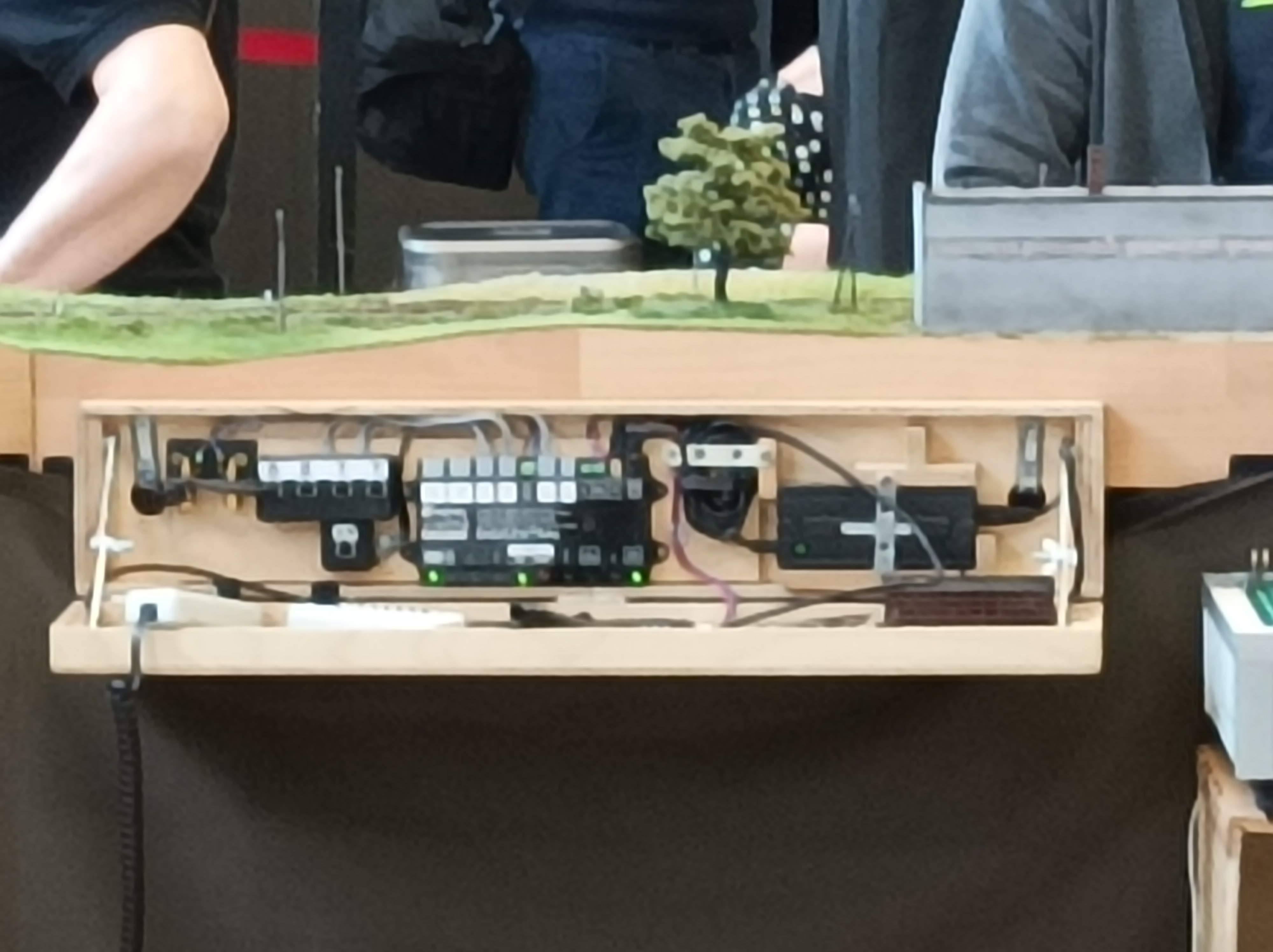 Pomysł polega na załadowaniu i zamocowaniu całości DCC w wygodnej skrzyneczce w taki sposób, że po jej powieszeniu na boku segmentu, mamy wygodny dostęp do całej instalacji w sposób uporządkowany, a drugie skrzydło skrzyneczki stanowi miejsce na myszki/fredy. Na koniec imprezy po prostu wypinamy kable i zamykamy skrzyneczkę - gotowa do transportu.