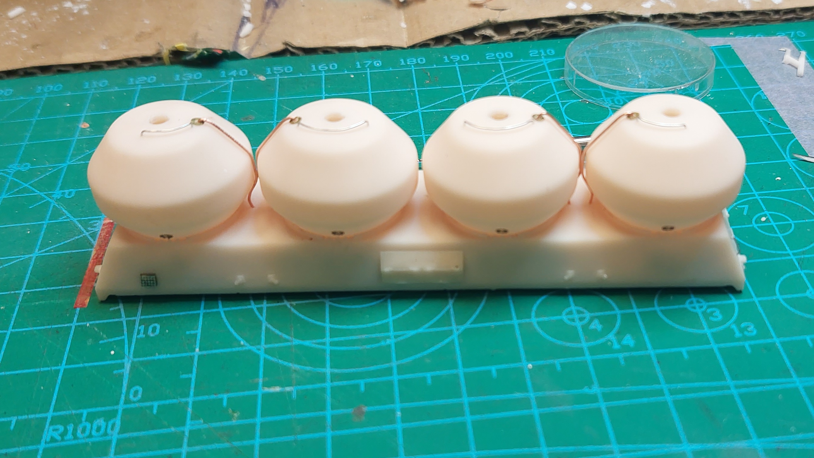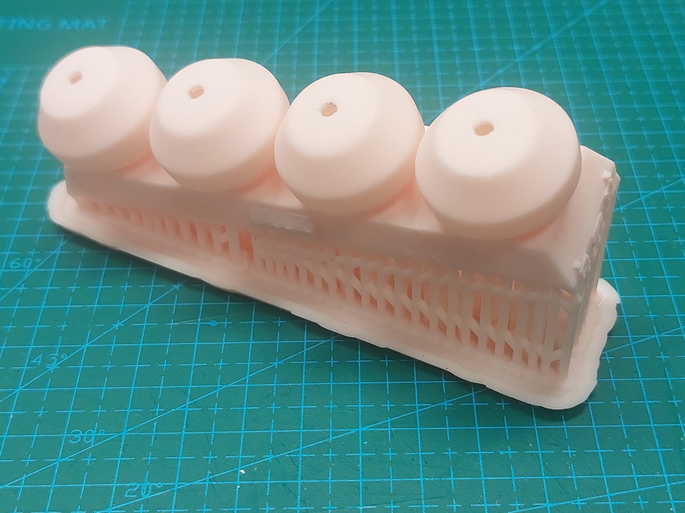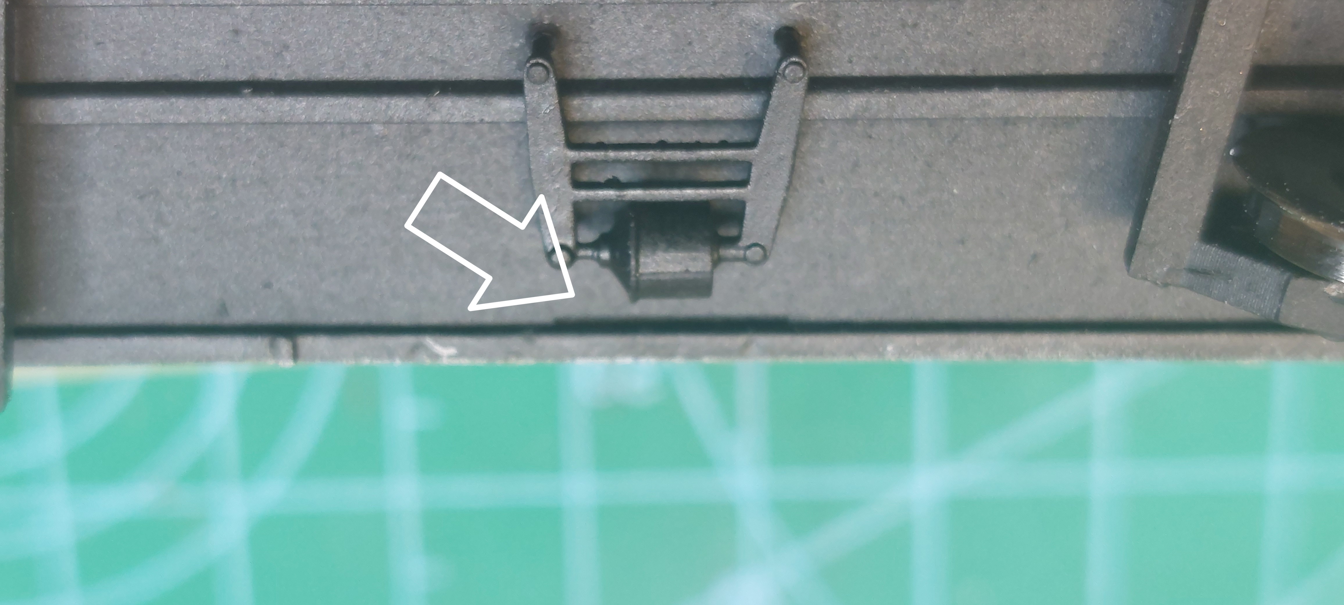 1. Odcinamy podpory 2. Szlifujemy spód zbiornika. (Każdy zbiornik ma od spodu numerek. Przyda się później przy osadzaniu na wagon. Warto go zostawić). 3. Poprawiamy otwory na szczycie oraz bokach zbiornika. Dla poręczy wiertło 0.3mm, dla rury wiertło 0.5, po bokach pod rury wiertło 0.6mm