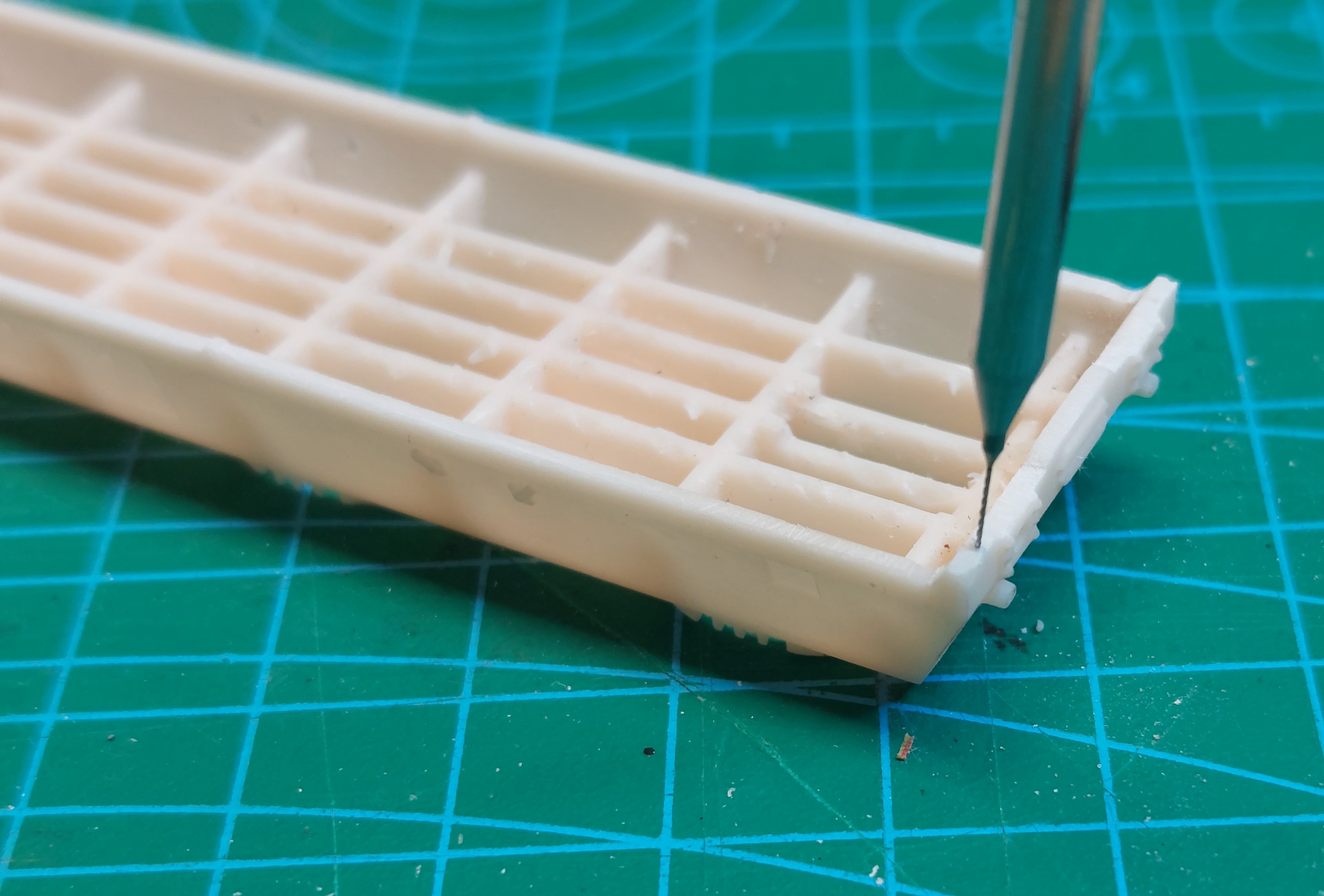 Odcinamy podpory i szlifujemy na kostce falbankę. Wiertłem 0.3 pogłębiamy otwory pod wspornik stopnia manewrowego.