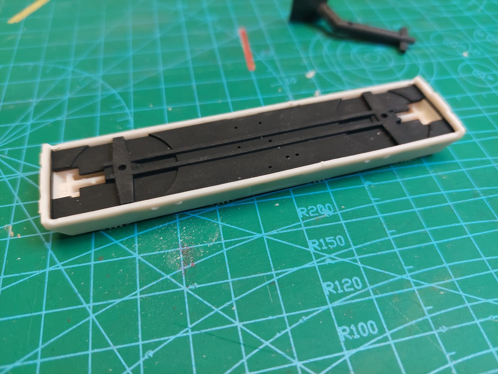 Przy podporze oznaczonej w kwadraciku należy uważać i zostawić kawałek elementu konstrukcji (taka.kostka 1x1x1mm). Łatwo to przeoczyć. Jest to wspornik do hamulca. I wklejamy podwozie.