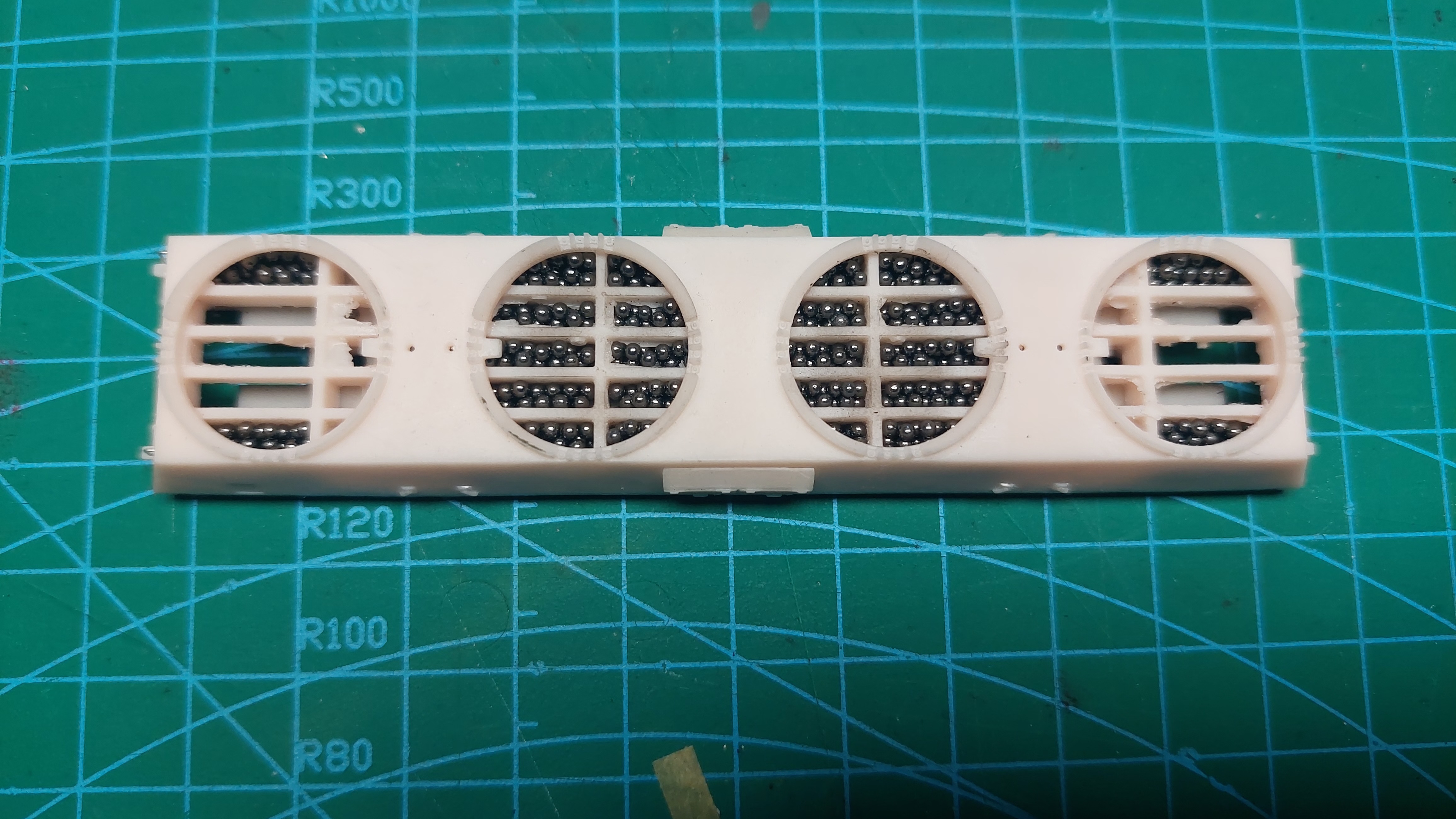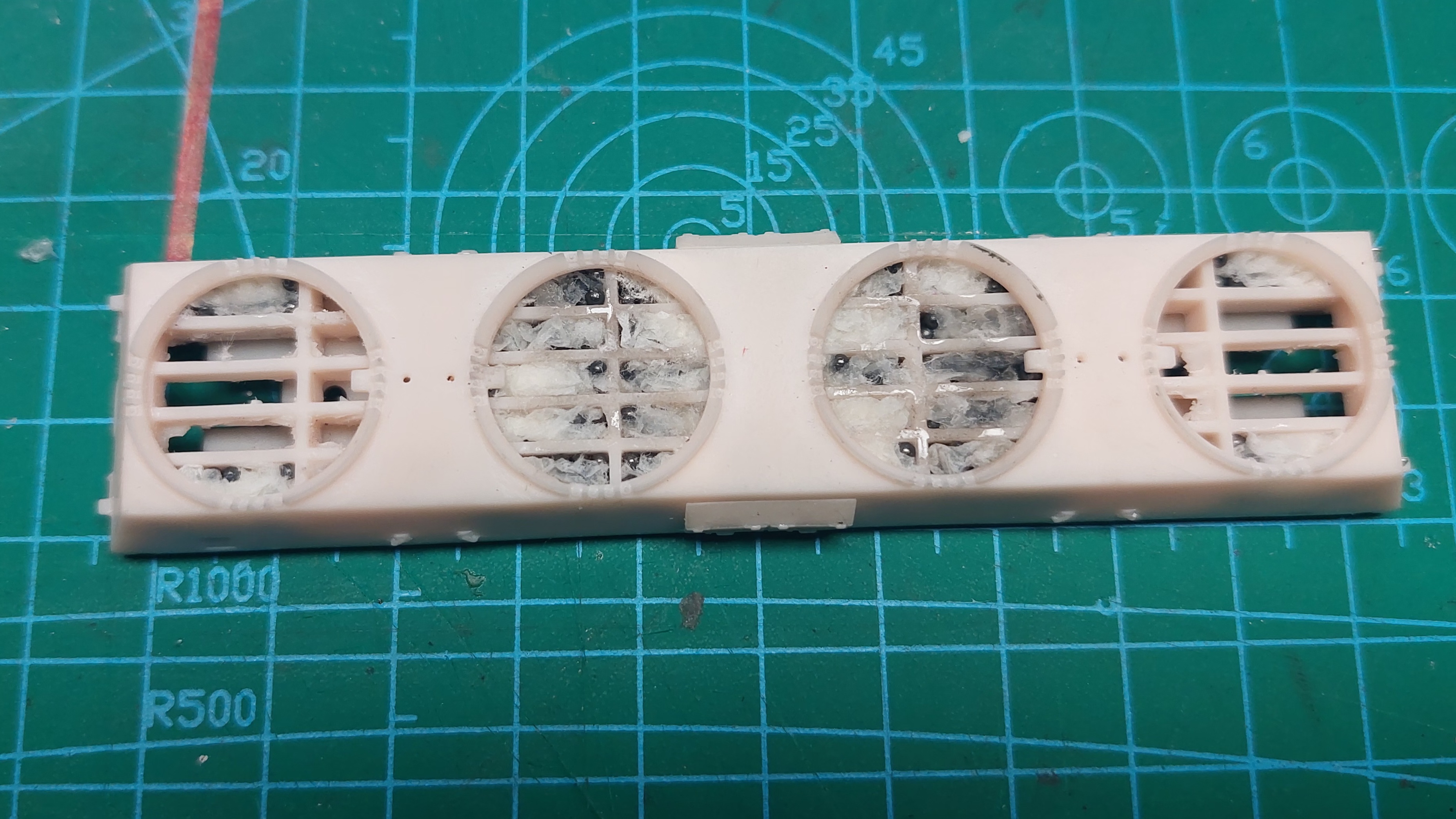 Następnie z papieru toaletowego albo chusteczki biorę jedną warstwę i upycham możliwie ciasno, żeby kulki nie grzechotały. Następnie zalewam delikatnie kropelką super glue. Pamiętać należy o tym żeby warstwa balastu nie wystawała ponad żebrowanie (bo zbiorniki nie siadą). 2. Wracamy do naszych oszlifowanych zbiorników.