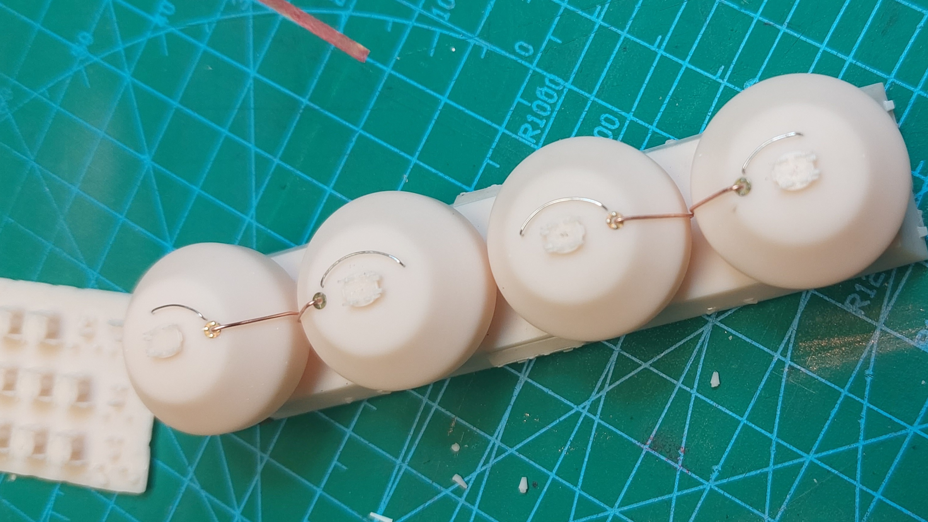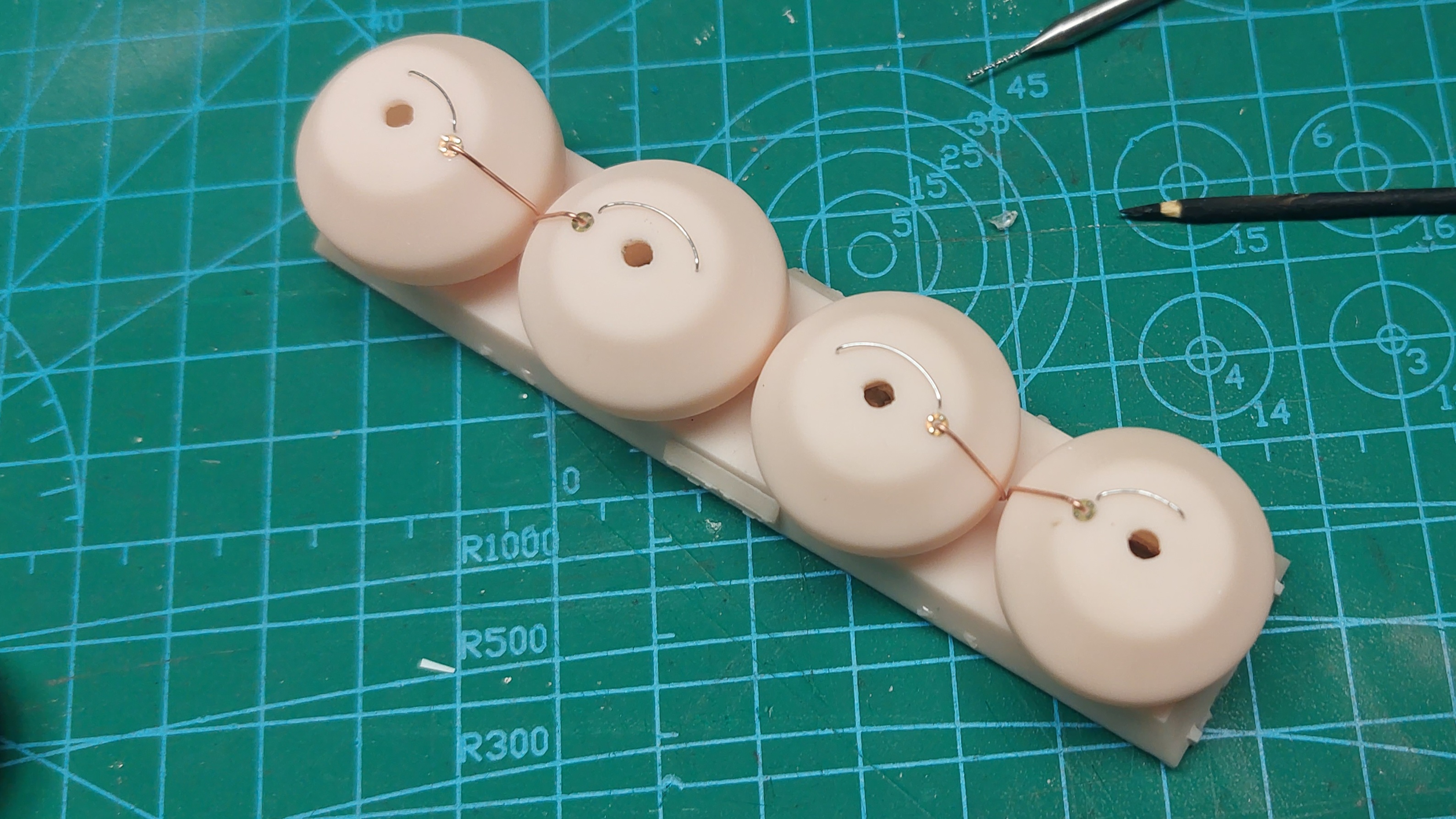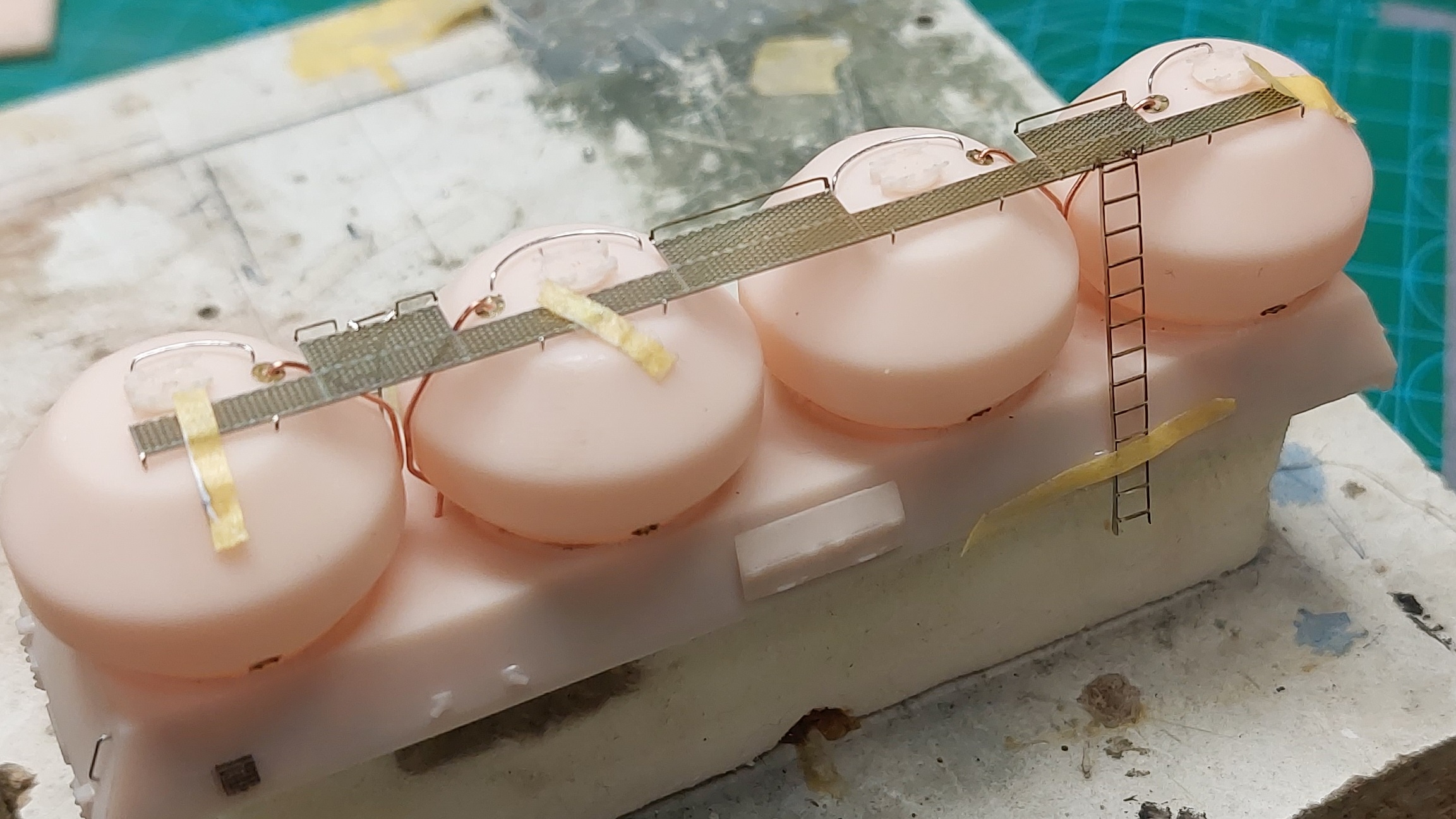Na małych łukach gniemy poręcze do zbiorników 1 i 4 a na dużym poręcze dla 2 i 3. Następnie bierzemy drut miedziany o średnicy ok. 0.5mm (np wyciągnięty z kabla skrętki), prostujemy sposobem jak wyżej, a potem formujemy na zbiorniku tak jak na zdjęciach. Tu dwie uwagi.