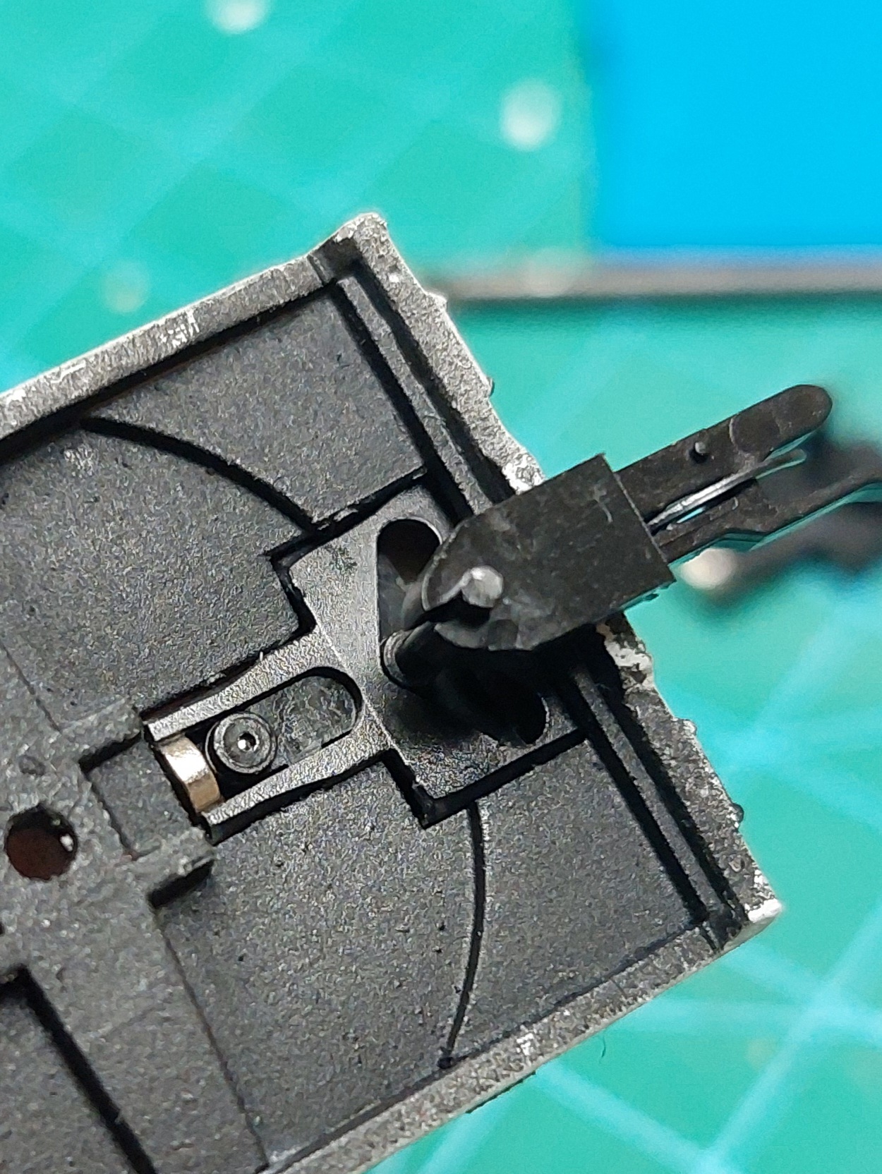Pod tablice hamulca są przygotowane podłużne otwory. Do koła hamulca dolutować drucik szerokości wagonu i przykleić na wystający "cycek", o którym pisałem wcześniej.
