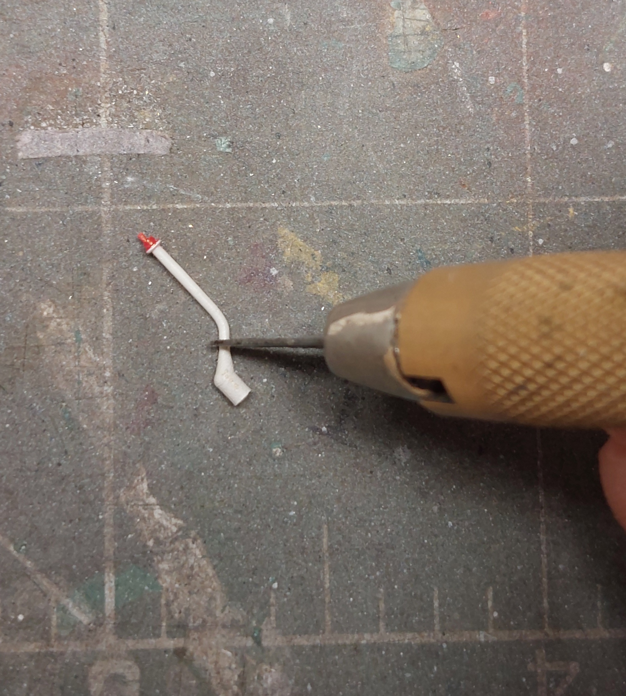 Z kawałka drutu stalowego 0.3mm robimy poręcze do zbiorników ( można robić że struny gitarowej ale trudniej się wygina).
