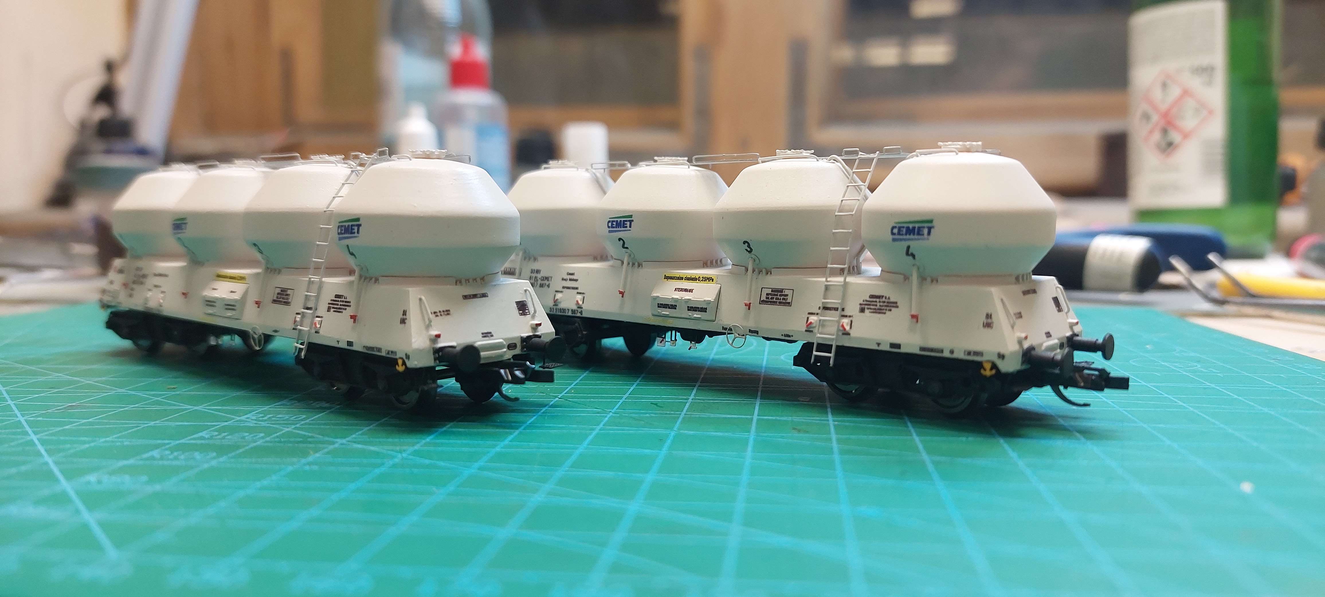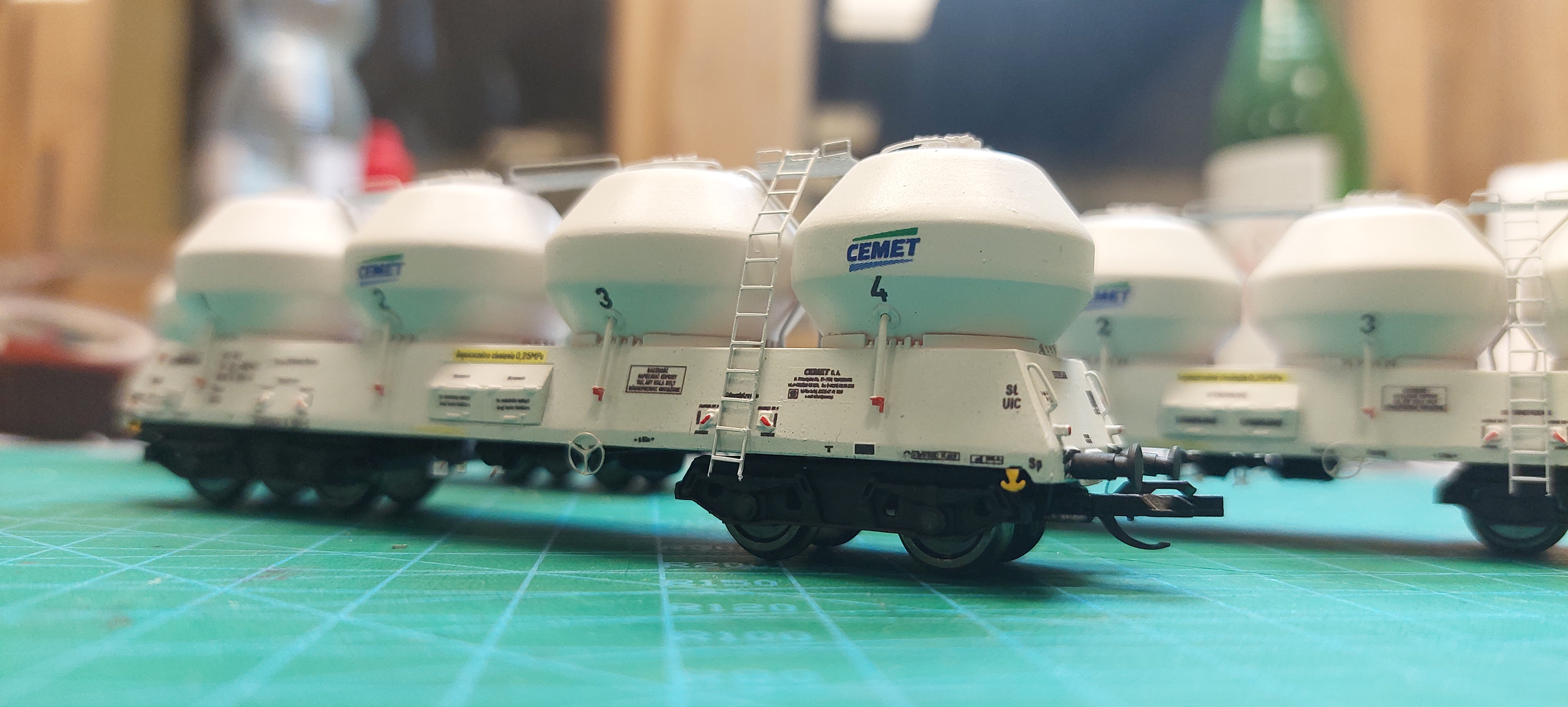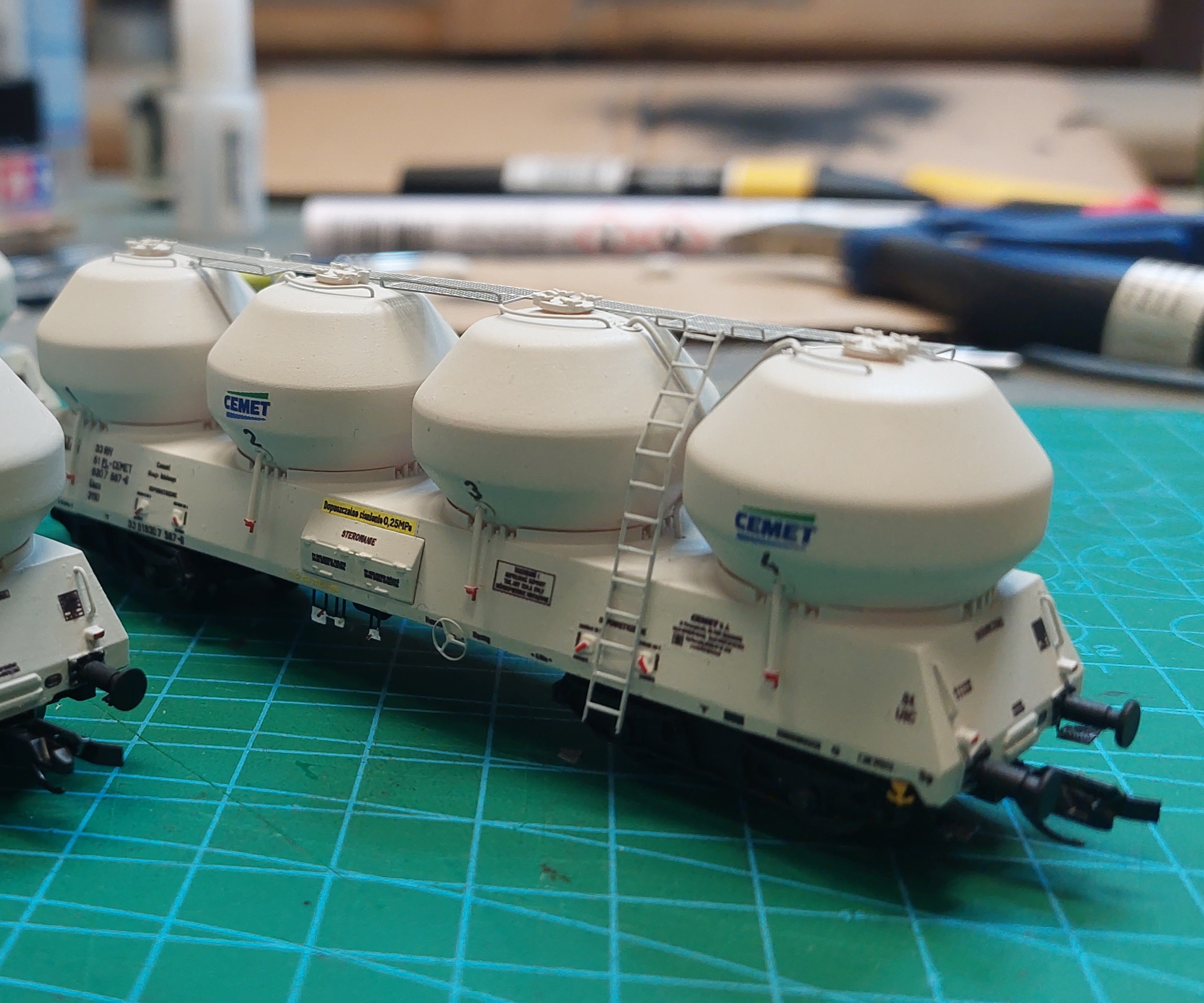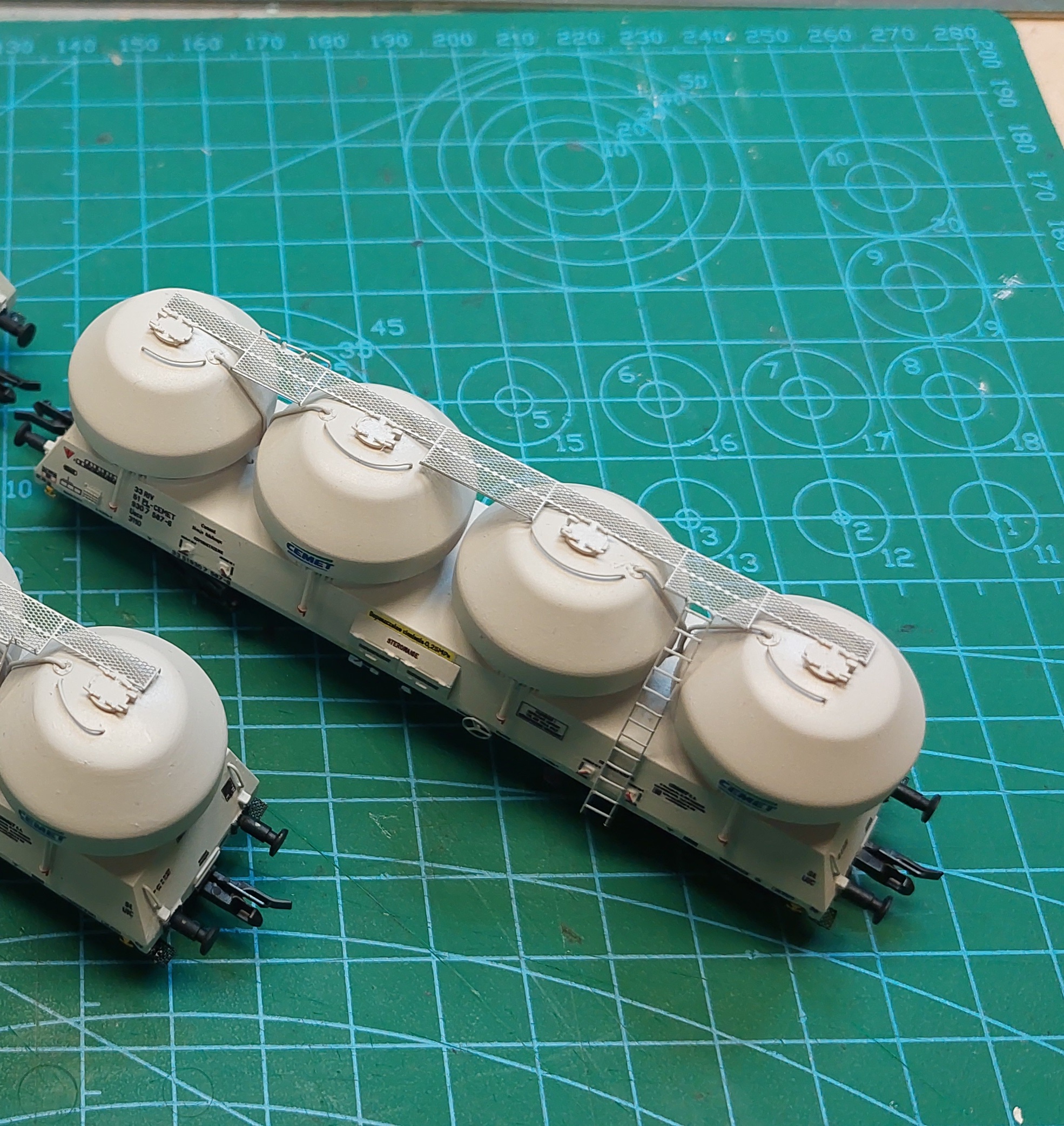 Zbiorniki w kółeczka (zwróćcie uwagę na to jak są zorientowane imitacje śrub), a wagon w kratkę na list (w wagonie jest zagłębienie gdzie kratka ma być przylepiona). Wkładamy poręcze w otworki, ustawiamy ich wysokość np. Na grubość wizytówki albo innej, cienkiej tekturki i smarujemy klejem od środka zbiornika.