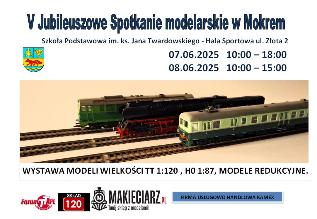 5 Jubileuszowe Spotkanie Modelarskie w Mokrem odbyło się w dniach 07-08.06.2025 r.. Impreza odbyła się na zasadach FREMO. Obok Makiety TT prezentowali się modelarze z makietami TTe i H0e, makieta TT typu "tort", oraz kolej na Lego. Serdeczne podziękowania dla wszystkich mecenatów imprezy za pomoc w realizacji min. Dyrekcji szkoły w Mokrem, Gminie Grudziądz i Rogóźno, UM w Grudziądzu, firmie KAMEX. Uczestnicy zaangażowani w ten projekt dali z siebie 1000%. Przygotowanie do imprezy było trudne, bowiem dostosowanie modułów do FREMO wymagało dużego wysiłku ze strony Północy i Południa , na szczęście poszło wszystko zgodnie z planem, a napotkane trudności pokonywaliśmy z marszu. Dziękuje jeszcze raz wszystkim uczestnikom, za wsparcie i pomoc. Mam nadzieje że dojechaliście bezpiecznie do swoich domów (nie od wszystkich mam info). Jeszcze raz dziękuję i do zobaczenia na torach TT.